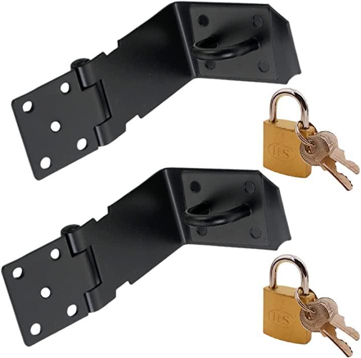 セット内容:直角ラッチ2個(素材:ステンレス カラー:ブラック)、南京錠2個(サイズ:約2.4x2.3x1.1cm 素材:鉄 カラー:ゴールド)