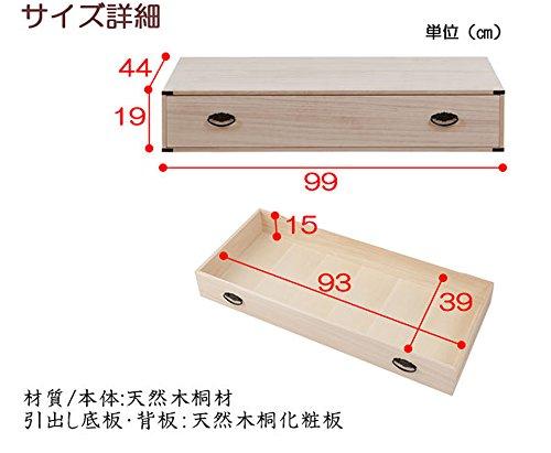 人気の定番桐タンスシリーズにベッド下やクローゼット上などのすきまにセットできる1段タイプの桐箪笥が新登場!増える着物や浴衣収納にスタッキングして積み重ねることも可能。1段ごとに買い足せ、お財布にも優しい良心価格。単独使いやセット購入又は同シリーズの桐箪笥を既にお持ちの方も重ねて使える万能型。着物だけでなく、洋服やタオルケット・薄手の布団などシーズン問わず幅広く使用できます。何かと日本の四季に不可欠な桐材を使用した桐タンス。世代を超えて引き継ぐ大事な着物の収納は桐で決まり。商品サイズ/ 本体: (約)幅99×奥行44×高さ19cm 引出し内寸/ (約)幅93×奥行39×15cm耐荷重量/ 天板: 約10kg 付属品/ 上下連結金具商品の仕様/ 本体: 天然木桐材、引出し底板・背板: 天然木桐化粧板 商品重量:約7kg 日本製 完成品