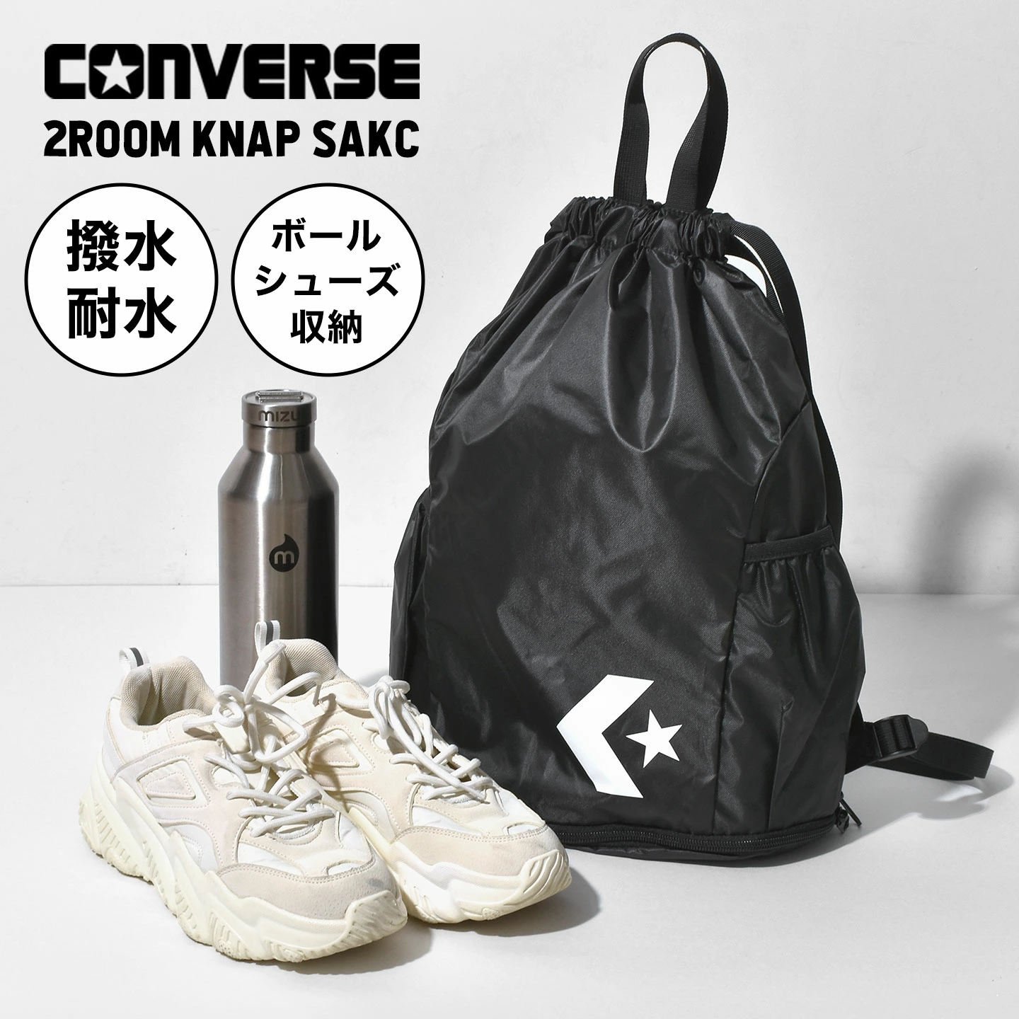 【2ルームナップサック】軽量かつ大容量!靴や濡れた水着などを分けて収納できる2ルーム仕様のナップサック。バスケットボールやバッシュなどのかさばるスポーツアイテムもしっかり収納でき、高耐水圧・撥水加工の生地は海やプールや雨で濡れたり、汚れたものを入れたりしても大丈夫。ペットボトルや折り畳み傘が入るサイドポケットもついて、収納力抜群。お子様の部活や通学、塾などはもちろん、大人のジムバッグにも。シンプルなコンバースのロゴデザインで世代問わず使えるアイテムです。