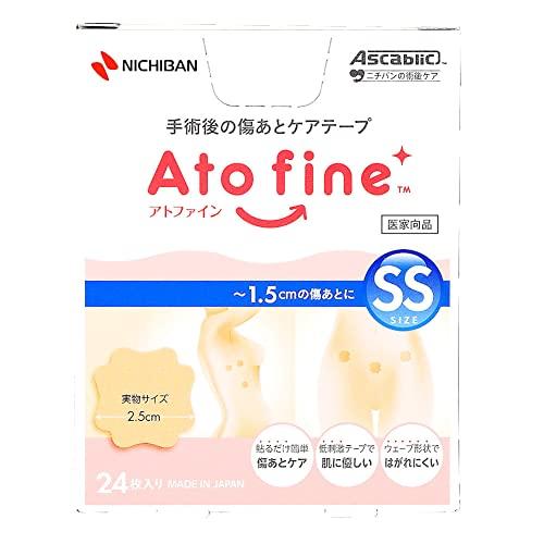 手術後の傷あとを、誰でも簡単にケアできるテープがアトファインです。目立つ傷あと(肥厚性瘢痕・ケロイド)の要因となる伸展刺激・摩擦刺激・紫外線から傷あとを守ります。サイズ・SSサイズ 25mm×25mm ※~1.5cmの「傷あと」に内容量・24枚入り交換の目安・5~7日に1回を目安に交換してください。ただし、貼付の目安に限らずテープがはがれてきたら貼り替えてください。貼ったまま入浴できます。使用上の注意・傷あととは、傷口が完全に閉じている状態のことを指します。開いている傷口や抜糸前の縫合創に直接使用しないでください。・皮ふを清潔にし、乾いた状態で貼ってください。テープを貼る部分の毛は、傷あとを傷つけないように注意して、短く切ってから貼ってください。・皮ふかぶれやはがれの原因となりますので、テープは引っ張って伸ばした状態で貼らないでください。・本品の使用により発疹・発赤、水疱、表皮はく離、かゆみ等が生じた場合は使用を中止し、医師又は薬剤師に相談してください。・はがす時は、皮ふや傷あとを傷めないように、テープの端から傷あとに向かってゆっくりとはがしてください。・直射日光を避け、なるべく湿気の少ない涼しい、小児の手の届かない所に保管してください。・再使用しないでください。 【傷あとを守る】手術の傷あとを、伸展刺激(皮ふの動きで傷あとが引っ張られること)や、 摩擦・紫外線などの外部刺激から守り、傷あとを目立ちにくくします。 【重ね貼り不要。1枚で簡単ケア】1枚のテープで傷あとを固定できるため、短冊状に切って重ね貼りする必要がありません。 【手間がかからない】交換は5~7日間に1回。毎日交換する必要がありません。 【肌にやさしい】肌にやさしい粘着剤を使用しているため、はがすときの刺激が少ないテープです。また高い透湿性により、汗をかいてもムレにくく快適です。 【はがれにくい】テープのカドをなくした、はがれにくいウェーブ形状です。