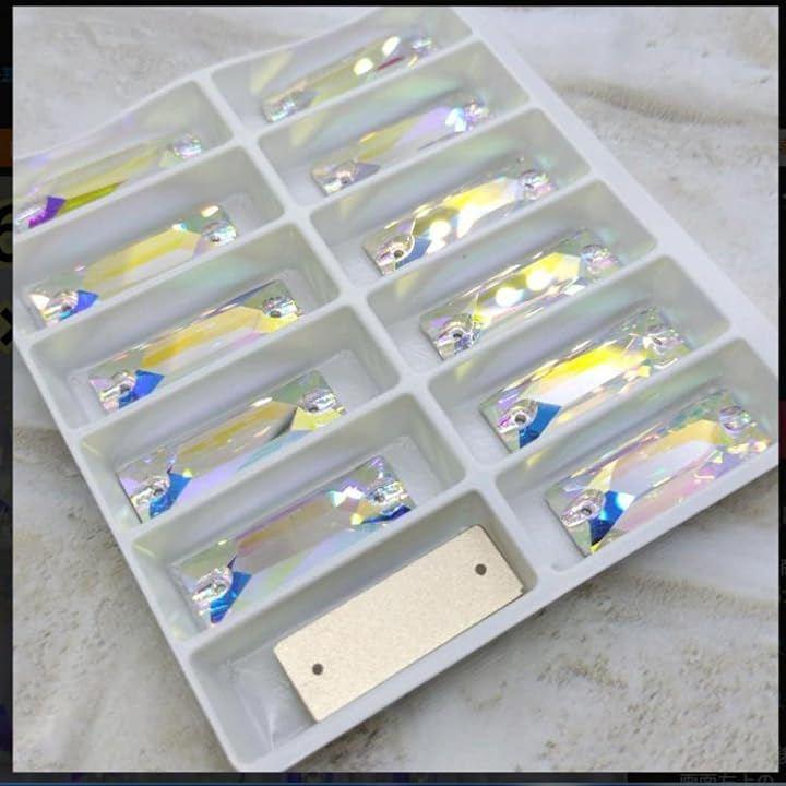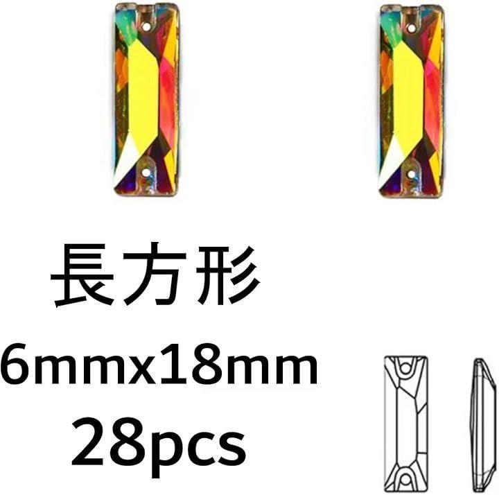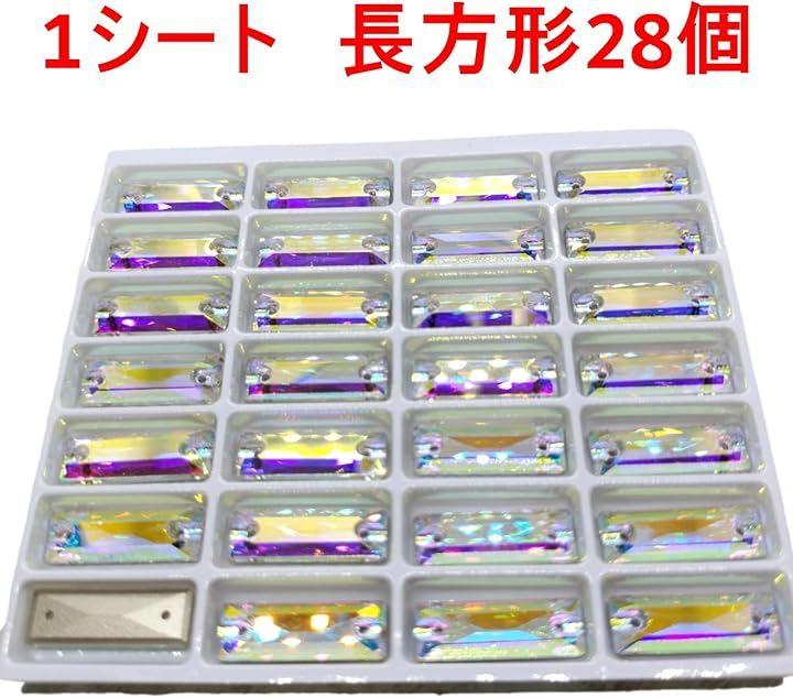 「素材」高品質クリスタルガラス(AB加工) 「仕様」縫い付け用両端穴2つ 「形状」長方形 「販売単位」各サイズ別トレー1つで販売(トレー内の個数はサイズ別)