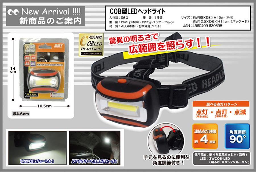 驚異の明るさで広範囲を照らす。非常時やレジャーで活躍できる。ハンドフリーで作業がスムーズ。手元を見るのに便利な角度調整付。サイズ:約幅65×奥行3×高さ45cm重量:約45g材質:本体/ABS樹脂、ベルト/合成繊維連続点灯時間:約4時間使用電池:単4形乾電池×3本(別売)点灯パターン:点灯強、点灯弱、点滅明るさ:最大275ルーメン角度調節:90度