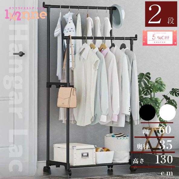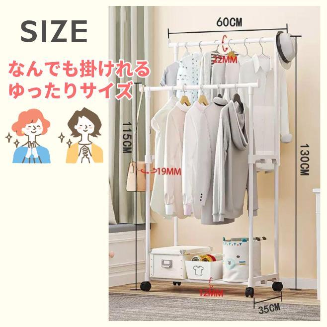 | 【130cm ロングサイス ダブルハンガーラック】 | 横60cm × 縦35cm × 高さ130cm の大容量、ロングサイス、ダブルハンガーラック。 パイプ式なので、組み立ても簡単で女性の方でもらくらく組み立てできます。 2段目がズボン掛けとしても使いやすい高さになっています。 |