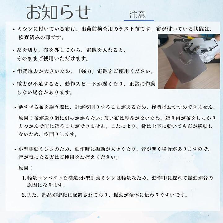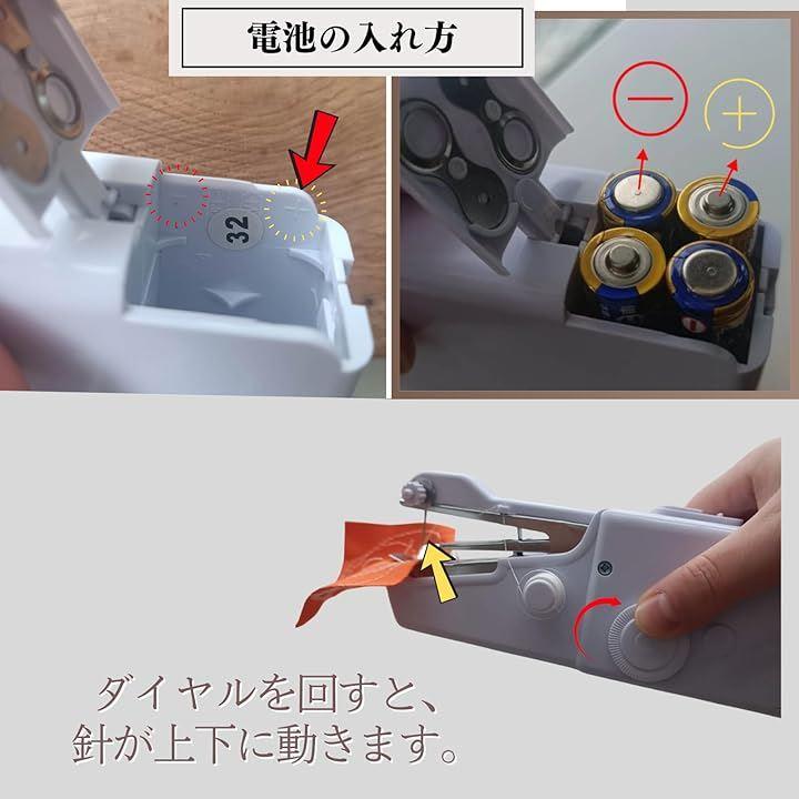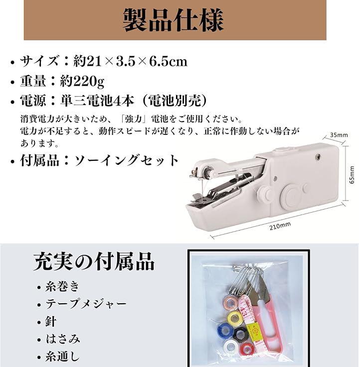 「製品仕様」サイズ:約21x3.5x6.5cm 重量:約220g 電源:単三乾電池4本(電池別売)(電池別売) 付属品:ソーイングセット カラー:ホワイト