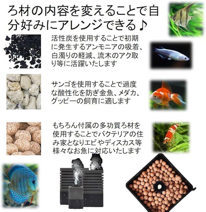もちろん付属の多功質ろ材を使用することでバクテリアの住み家となりエビやディスカス等様々なお魚に対応いたします