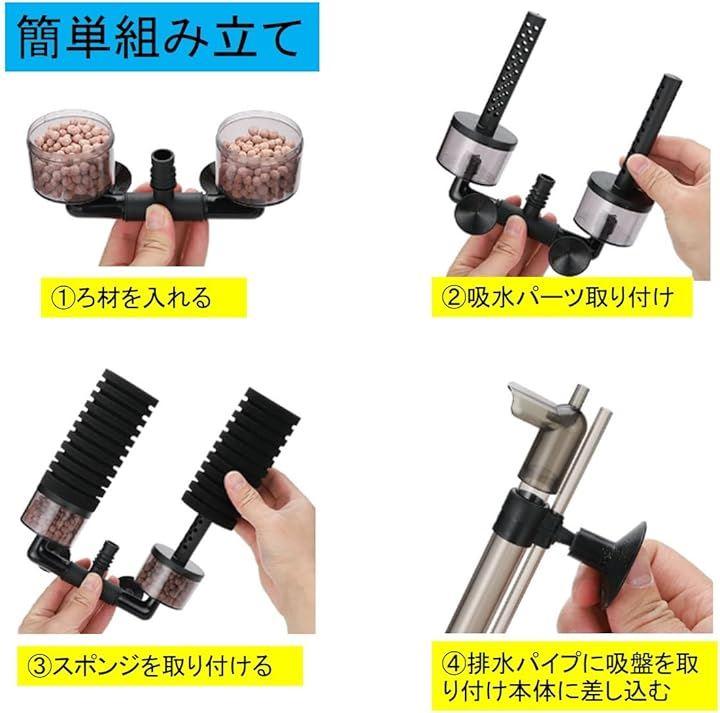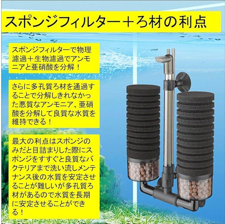 「スポンジフィルター+ろ材の利点 (1)」スポンジフィルターで物理濾過+生物濾過でアンモニアと亜硝酸を分解。