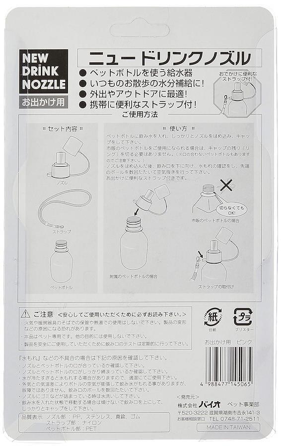 市販のペットボトルをきれいに洗浄して飲み水を入れしっかりとノズルをはめ込んで下さい。キャップの残り(リング)を切る必要ありません。ノズルをはめ込んだ後、飲み口を下に向け、水漏れの確認をし、先端ボールを数回たたいて空気抜きを行って下さい。