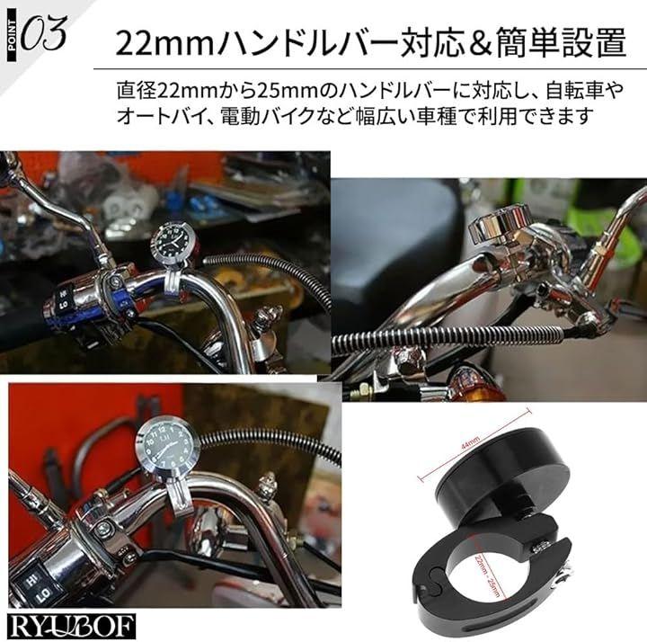 「22mmハンドルバー対応&簡単設置」 直径22mmから25mmのハンドルバーに対応し、自転車やオートバイ、電動バイクなど幅広い車種で利用できます。