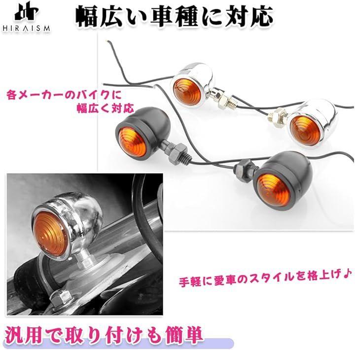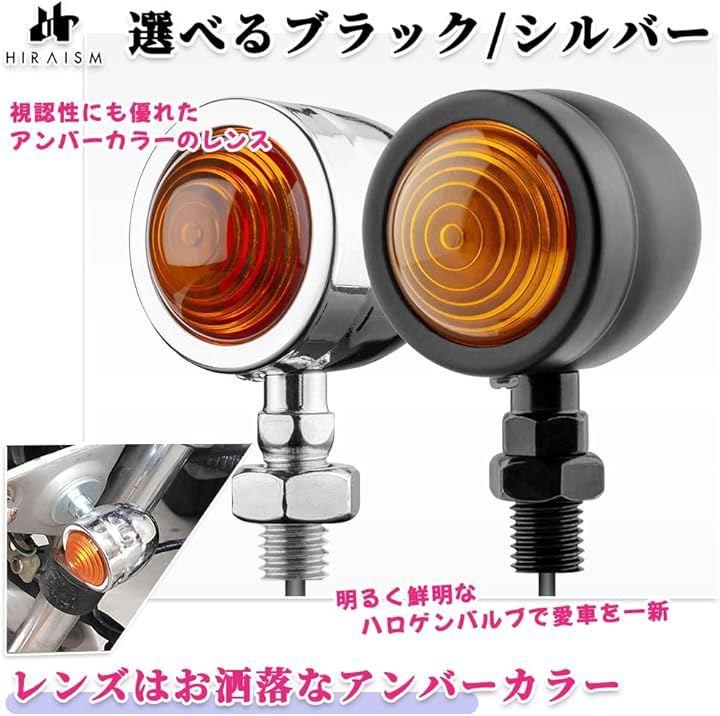 「商品内容」バイク用ウインカー:4個 <カラー> カバー:ブラック/シルバー(クロムメッキ処理) レンズ:アンバーイエロー <サイズ> 高さ:65mm 奥行:50.5mm レンズ直径:37mm 取付ボルト径:10mm 取付部分の長さ:16mm ハーネス長:25cm 重量:103g / 1ペア 光源の種類:白熱光源・ハロゲン電球 使用電圧:12V 電力:5W 接続方法:プラス/配線 マイナス/ボディアース