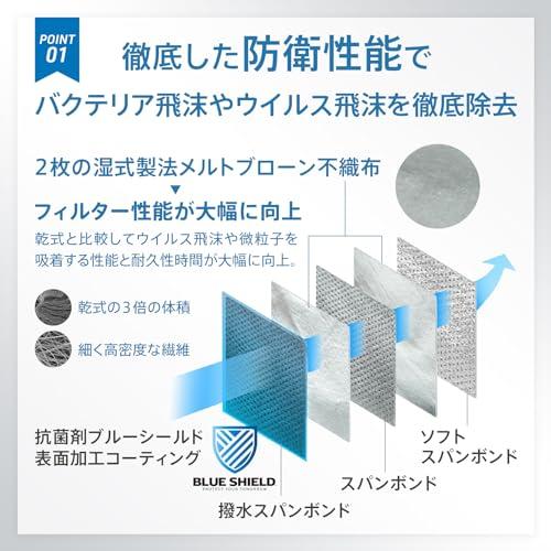 【JIS規格 (JIS T9001) に適合】JIS T9001(医療用クラス3)に適合しています。※詳細はパッケージご確認いただけます。【飛沫や微粒子の捕集率の高く呼吸がし易い】ブルーシールドマスクには、湿式製法で製造された高性能・高通気性のメルトブローン不織布を採用しています。そのため大人にはもちろん、体力の弱い高齢者やお子さんの呼吸の負担がとても少ないです。【複合金属イオン抗菌コーティング処理】自社開発の金属イオンによる抗菌剤ブルーシールドをマスク前面(外側の表面だけ)にコーティングしています。この抗菌コートの効果で、マスク使用時の菌の増殖を抑え、いやな臭いの防止と清潔さを保ちます。【5層不織布構造】あらゆるシーンで徹底した防衛性能のマスクを目指して開発された結果、5層構造となり、2層で静電フィルターの採用に至りました。様々な機能を持った5層の不織布が「徹底して守る」というコンセプトに貢献しています。【原料も日本製の国産マスク】弊社のマスクすべては国内自社工場(大阪府八尾市)のクリーンルームにて製造しています。厳選した国産のスパンボンド不織布・耳ひも・ノーズバーだけを使用して、徹底した安心と共に衛生管理も実施しており、出荷前には安全性を確保するため、抗菌コーテイング処理と高温殺菌処理の2重の抗菌処理を実施しております。【血液や飛沫侵入をしっかり防止】高い撥水性能を持つ不織布を一番外側に配置し、医療で発生する血液飛沫や咳などの水分を帯びた飛沫の侵入をしっかり防ぎます。原産国 日本(#lf)(#lf)(#lf)商品購入前に、ストア紹介ページをご確認ください。