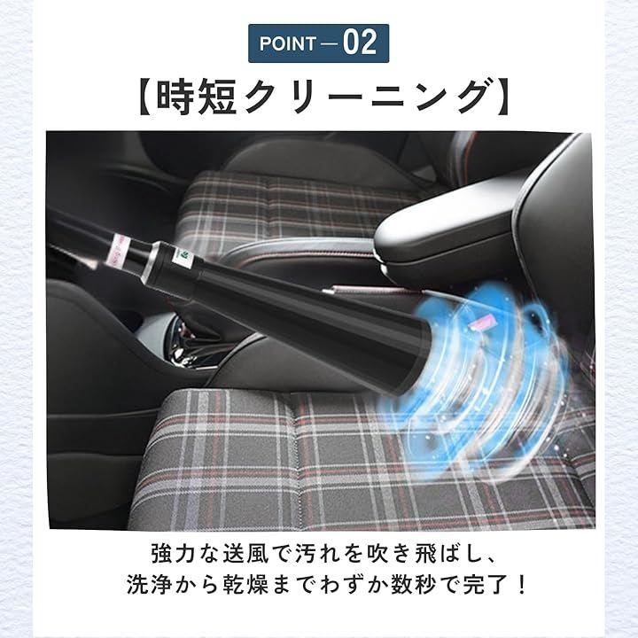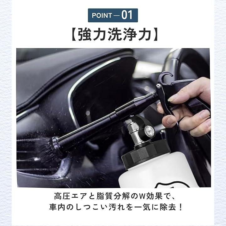 「強力洗浄力」高圧エアと脂質分解のW効果で、車内のしつこい汚れを一気に除去。