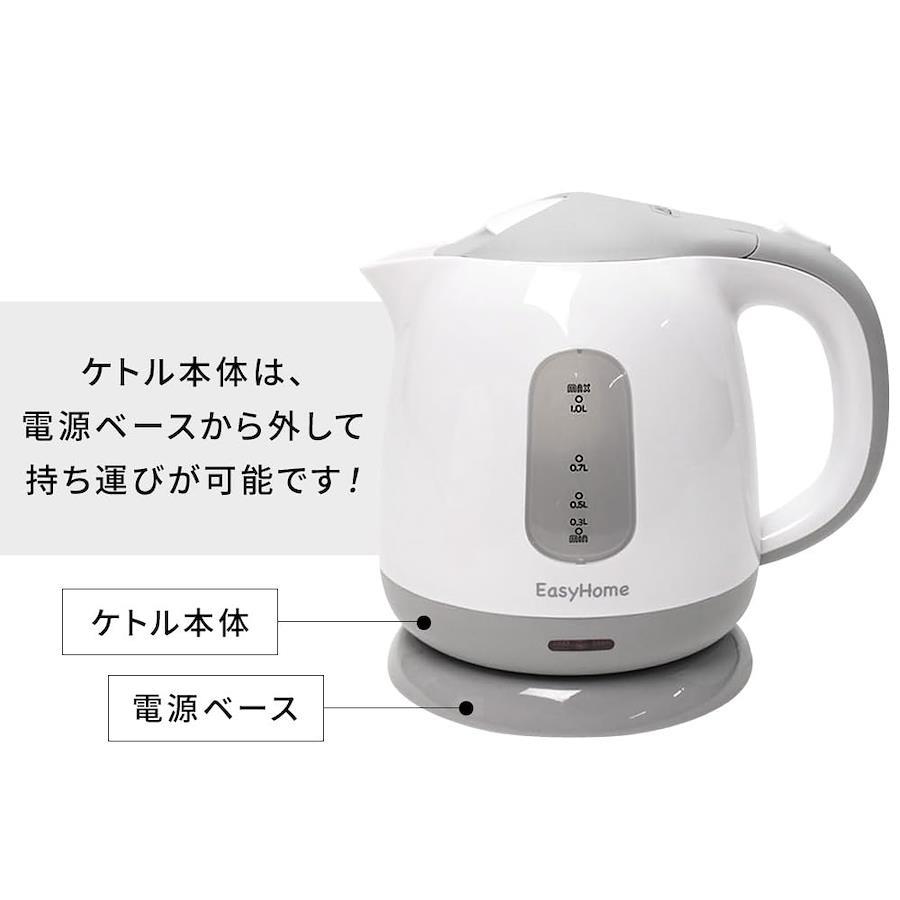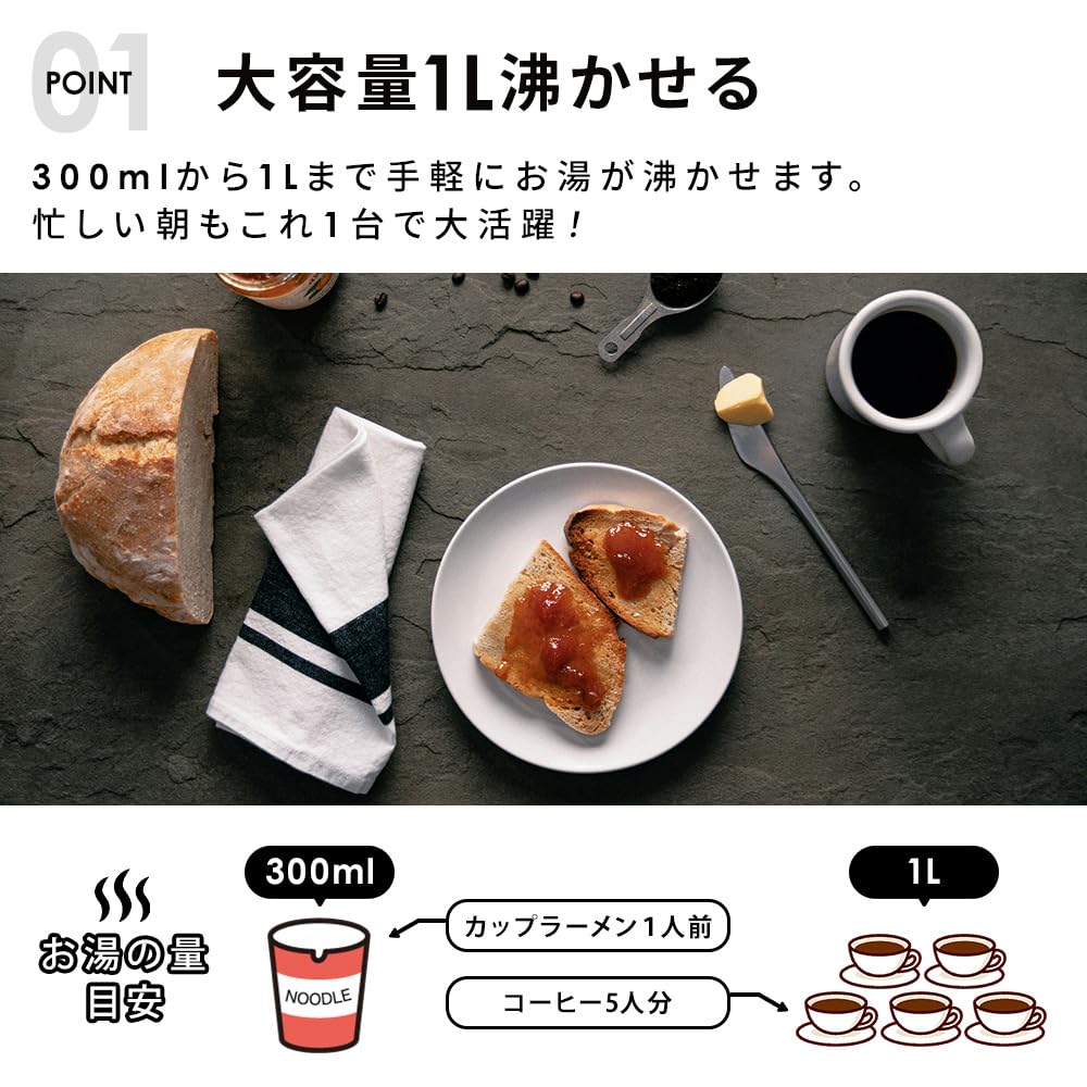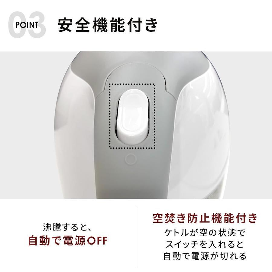 飲む時だけ、必要な時だけ沸かす、エコスタイルのコードレス電気ケトルです。最大容量は1000mlでたっぷりお水を沸かす事ができます。300mlからでも沸かす事ができるので、一人前のカップラーメンや5人分のコーヒーまで使用する事ができます。お湯が切れると自動的に電源が切れるので、ふきこぼしもありません。【使用上の注意】・本機には転倒時の漏水防止機能は有りません。転倒すると熱湯が漏れ出し火傷の恐れがございます。子供の手の届かない、又コードが足等に引っ掛からない場所に設置してください。・ケトル本体に水が入っていないときは、スイッチをONにしないでください。故障の原因になります。・水以外のものを沸かさないでください。故障や汚れの原因になります。・本製品は保温機能がありませんので、必要な時に必要な量だけ沸かしてください。おしゃれなシンプルデザインです。