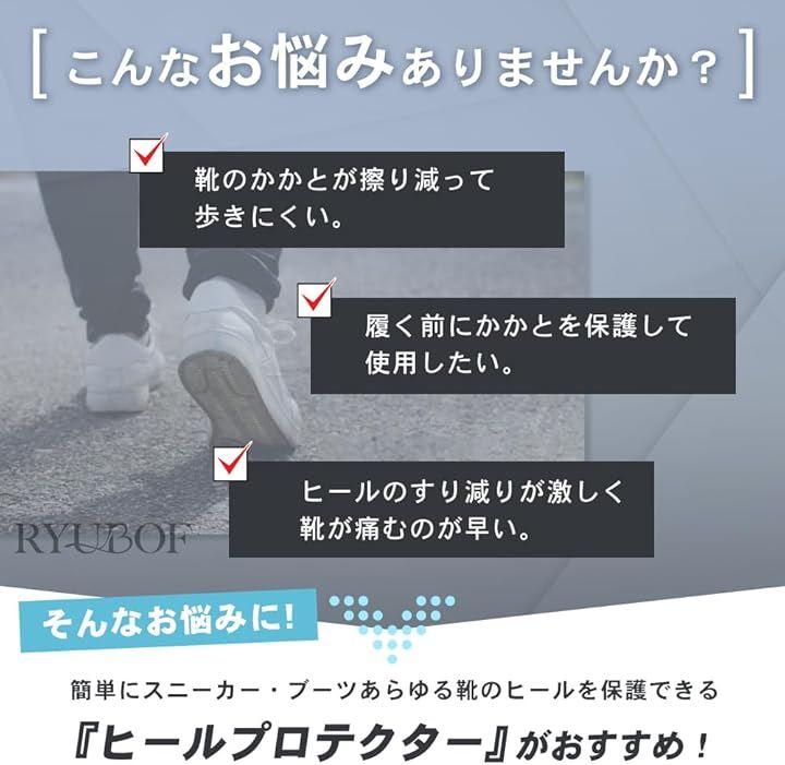 「ヒールプロテクターでかかとすり減り防止」ヒールプロテクターとヒールガードを貼るだけで、スニーカーや革靴のかかと部分をしっかりガードし、すり減りやひび割れ、穴あきなどのムダなダメージを防ぎ、靴底の寿命延長をサポートします。