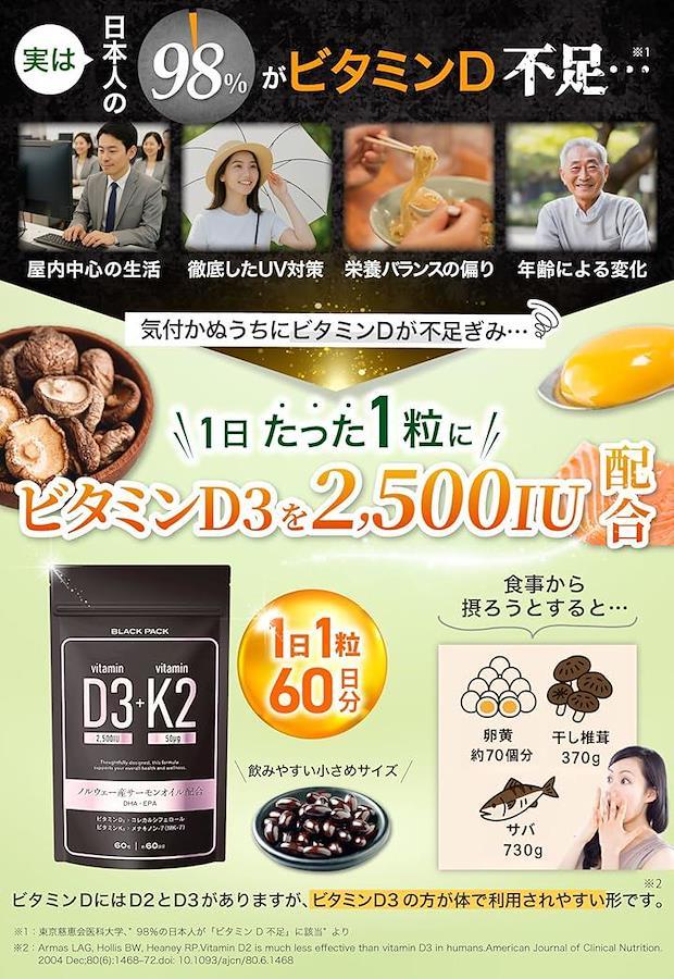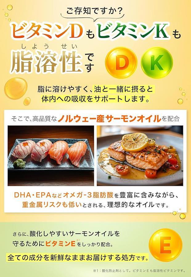 「北欧の清らかな海から「ノルウェー産サーモンオイル」配合」ビタミンD3・K2の吸収効率をサポート。