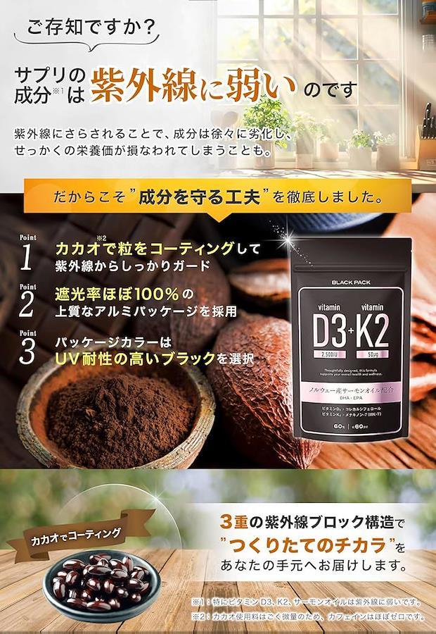 「カカオコーティングで粒をプロテクト」「遮光率ほぼ100%の上質なアルミ箔パッケージを採用」「UV耐性ブラックパッケージで二重の防御」。