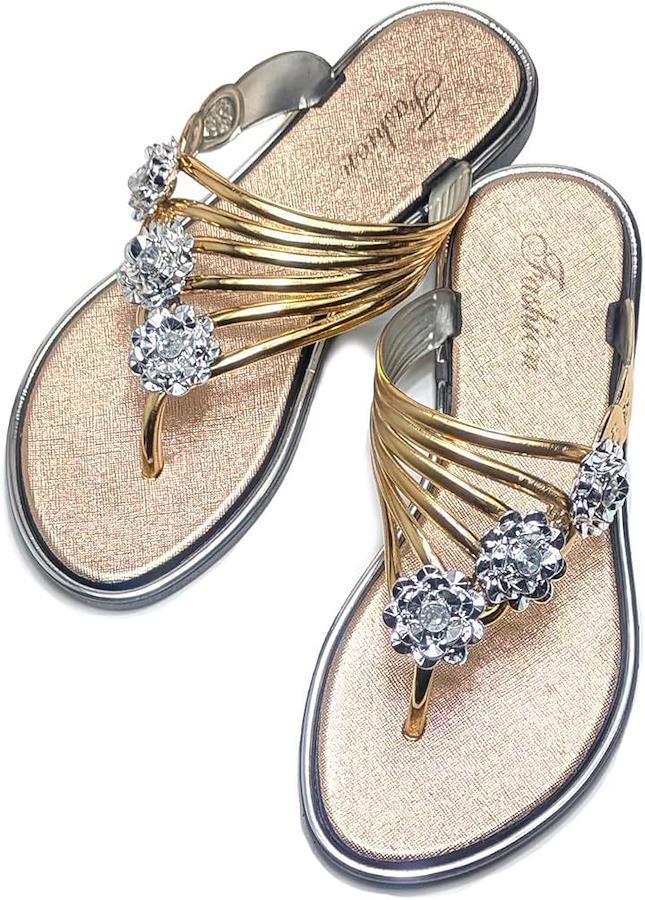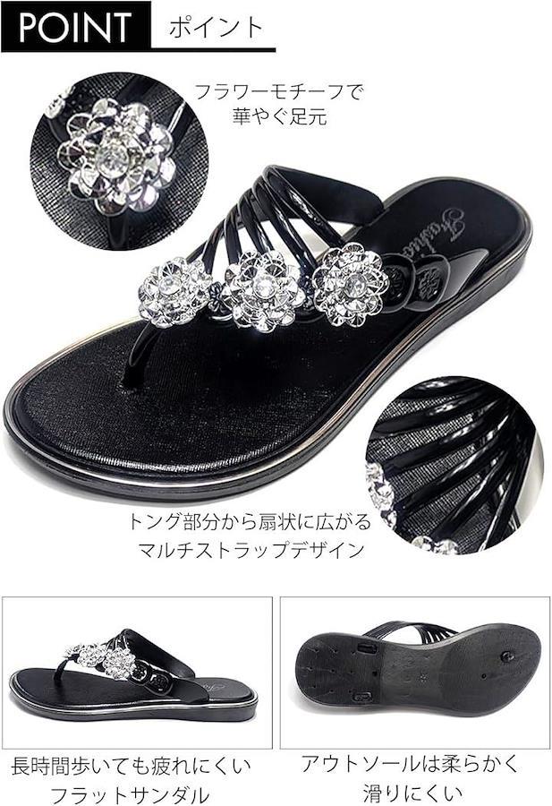 花のビジュー装飾が光に反射して、足元が一気に華やかに。夏のコーディネートに映えるきらきらアクセント。