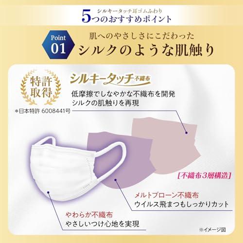 【シルクのような肌触り】口元側をシルクのような肌触りの滑らかな素材、外側はやわらかい風合いとなるような不織布を採用。直接肌に触れる部分の肌触りにこだわりました。さらに、耳かけゴムを外付けにすることで肌あたりが良くなるように工夫しています。【長時間使用しても耳が痛くなりにくい】シルキータッチマスクは、ゴムを伸ばしてもゴム幅がほぼ変わらない構造であり、耳が痛くなりにくいふわふわゴムを採用しているため長時間の着用にもおすすめです。顔のラインにぴったりフィットし、立体プリーツ加工で不快な息苦しさを解消。【持ち運びに便利な個包装】 1枚1枚が個別に包装されているため、通勤・お出かけ・出張・旅行などの持ち運びにも便利です。いつでも衛生的に使用できるため、バッグの中にスペア用としてやご家庭や会社などでの備蓄用にもご活用いただけます。【使用方法】①表と裏を確認します。耳かけゴムが接着されている面が外側(顔にふれない面)です。②ノーズフィッターを鼻の形に合わせます。③顔にフィットさせながら耳かけゴムを掛けます。④顔の大きさに合わせてプリーツを上下に広げます。【商品詳細】内容量:100枚入り(50枚×2箱)/サイズ:やや大きめ/マスクサイズ:18cm×9cm/カラー:ホワイト(白)【注意事項】マスクは感染(侵入)を完全に防ぐものではありません。原産国 中国(#lf)(#lf)(#lf)商品購入前に、ストア紹介ページをご確認ください。