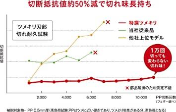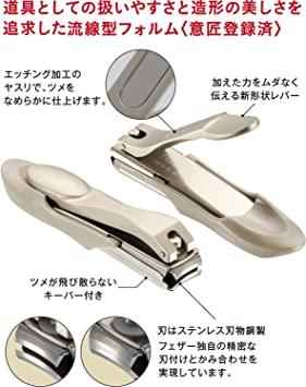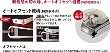 商品紹介●日本品質の進化形「スッと軽い切れ味」●新発想の切れ味、オートオフセット機構(特許取得済)。新採用の補助板が、最適な刃のかみ合わせを実現。切る力を効率よく刃先に伝えるので、ツメの硬さや厚さを選ばずに軽いタッチで心地良く切れます。●オートオフセット機構により、カット時の抵抗値が当社従来品に比べ約50%減少。これにより、刃先への負担が減り、優れた耐久力が生まれました。●従来品よりも抵抗が少なくカットできるため、ツメの断面がなめらかに仕上がり、カット音も静かになりました。●エッチング加工