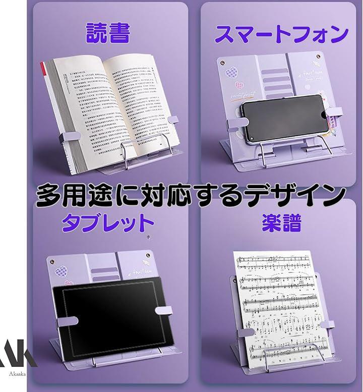 「多用途に対応するデザイン」 このブックスタンドは、単なる本置きにとどまらず、タブレットやスマートフォンの収納にも対応しています。