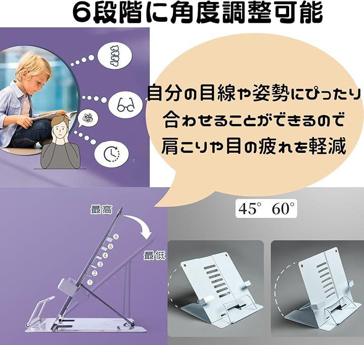 「高さ・角度調整機能で使いやすさ抜群」 使用シーンに合わせて、スタンドの角度は6段階(45°~68°)に調整可能で、自分の目線や姿勢にぴったり合わせることができます。