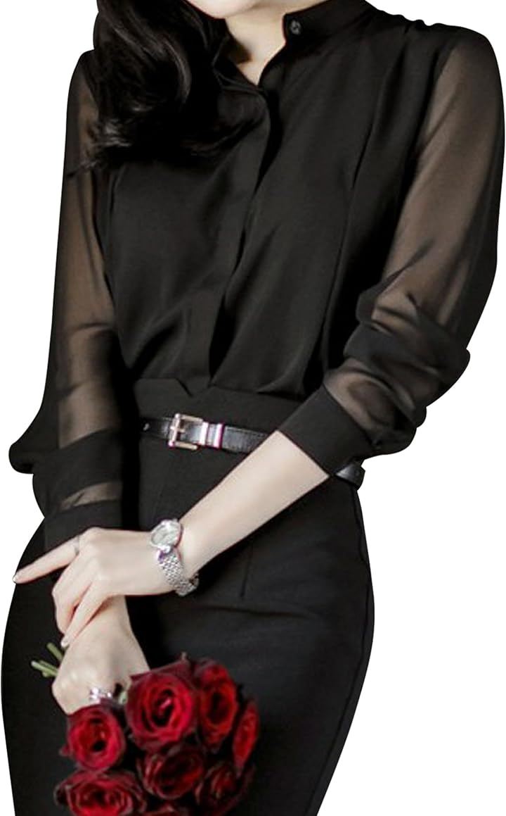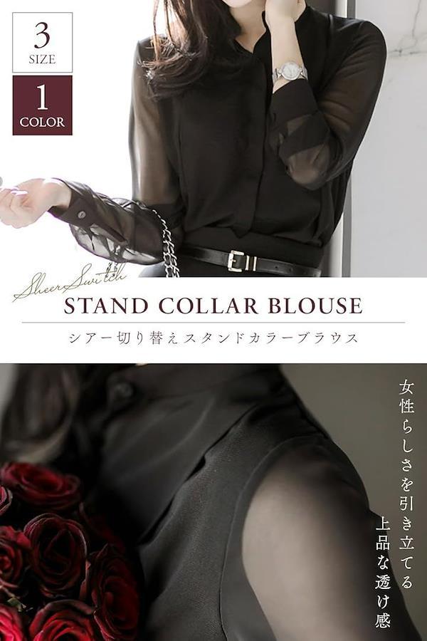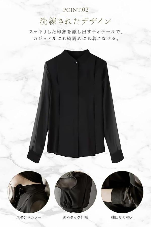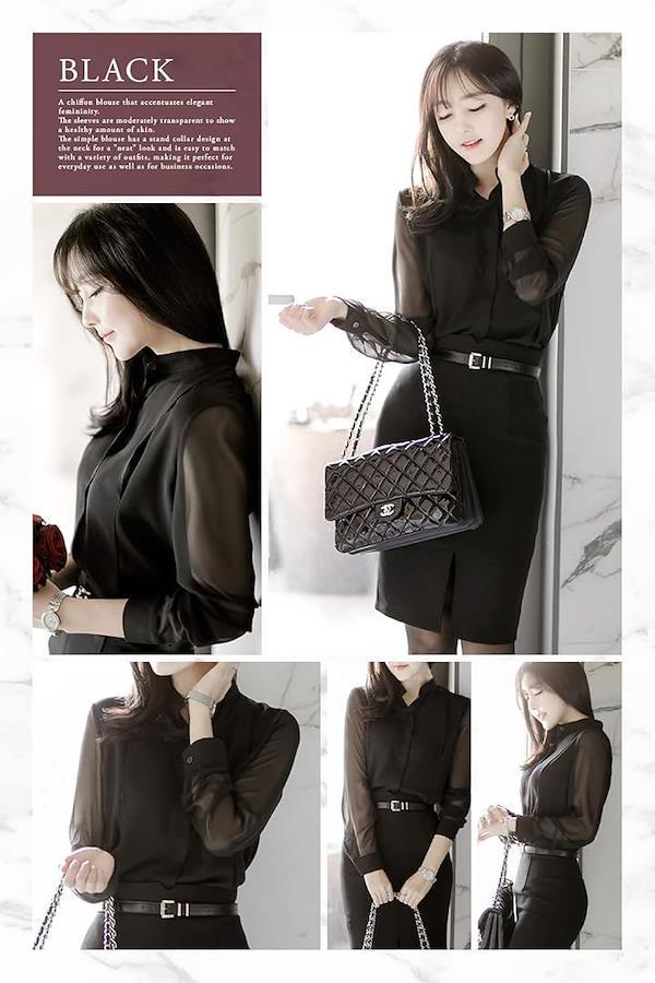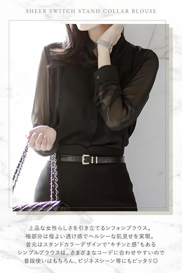 ポイント(1):上品な女性らしさを引き立てるシフォンブラウス。袖部分は程よい透け感でヘルシーな肌見せを実現。