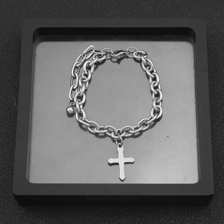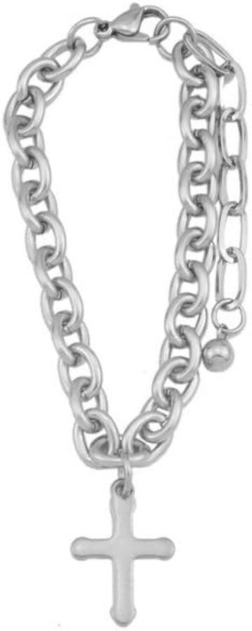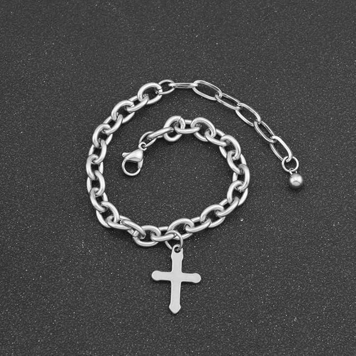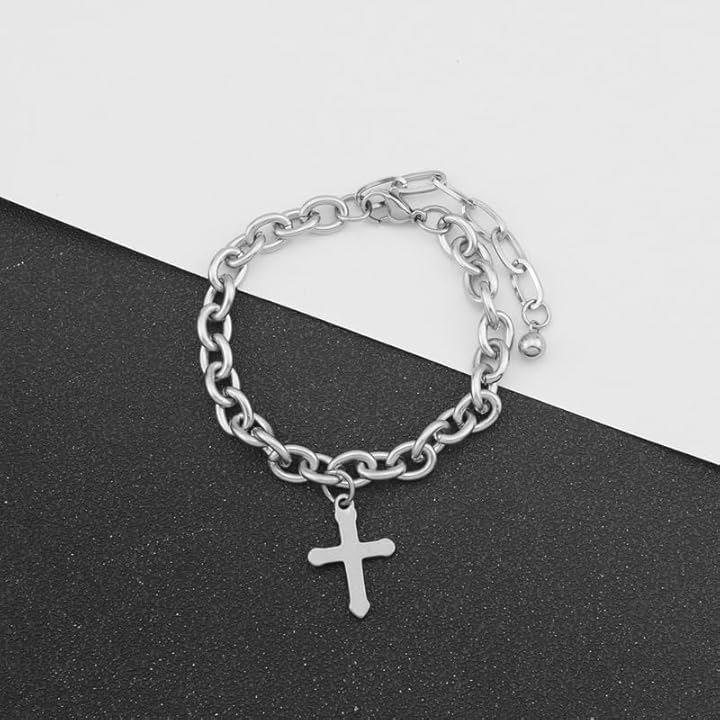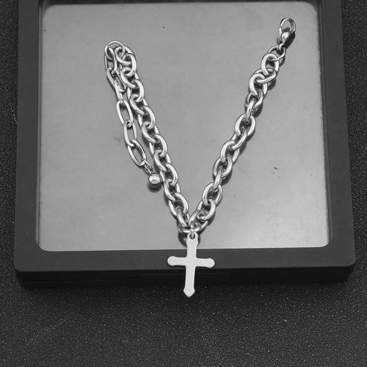 「デザイン」シンプルでありながらもスタイリッシュなこのブレスレットは、精巧に作られたクロスモチーフが中央に配置されており、男性らしい力強さと洗練された印象を演出します。