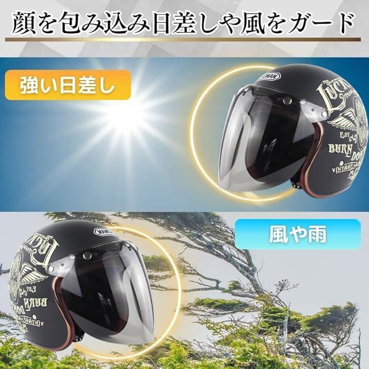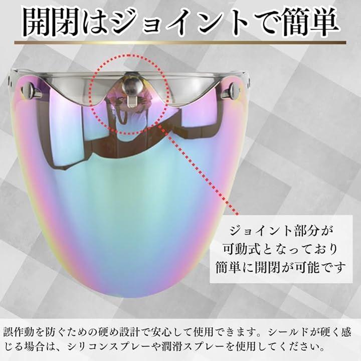 「風や日差しを効果的にカット」このバイクジェットヘルメットシールドは、顔全体を包み込むデザインで、風や日差しからの保護に最適です。