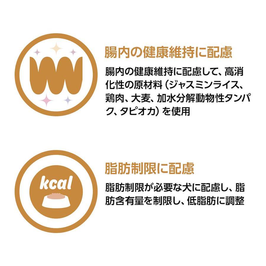 【消化器疾患(下痢など)の犬のための食事療法食】消化器疾患(下痢など)の犬に配慮し、特別に調製された食事療法食です。この食事は、下痢などの消化器疾患の犬に配慮し、高消化性の原材料を使用し、食物繊維や脂肪の含有量を調整しています。原産国:タイ◆腸内の健康維持に配慮◆ 腸内の健康維持に配慮して、高消化性の原材料(ジャスミンライス、鶏肉、大麦、加水分解動物性タンパク、タピオカ)を使用しています。◆エネルギー摂取に配慮◆ 低脂肪でも必要なエネルギーを摂取できるように食物繊維(小麦、大麦、サイリウム)と炭水化物(ジャスミンライス、タピオカ)の含有量を調整しています。◆脂肪制限に配慮◆ 脂肪制限が必要な犬に配慮し、脂肪含有量を制限し、低脂肪※1に調整しています。 ※1標準的な自社成犬用フードと比較し、約45%減