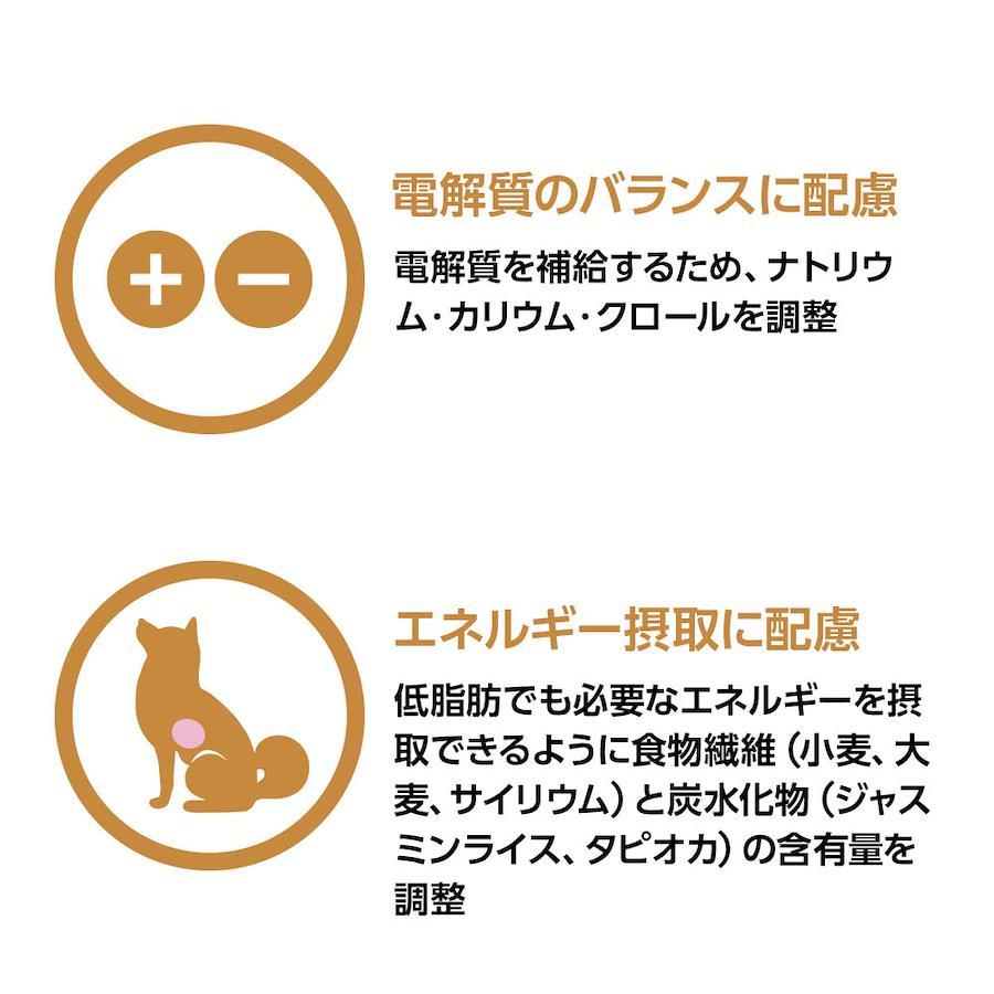 消化器疾患(下痢など)の犬に配慮し、特別に調製された食事療法食です。この食事は、下痢などの消化器疾患の犬に配慮し、高消化性の原材料を使用し、食物繊維や脂肪の含有量を調整しています◆腸内の健康維持に配慮◆腸内の健康維持に配慮して、高消化性の原材料(ジャスミンライス、鶏肉、大麦、加水分解動物性タンパク、タピオカ)を使用。◆エネルギー摂取に配慮◆低脂肪でも必要なエネルギーを摂取できるように食物繊維(小麦、大麦、サイリウム)と炭水化物(ジャスミンライス、タピオカ)の含有量を調整。◆脂肪制限に配慮◆脂肪制限が必要な犬に配慮し、脂肪含有量を制限し、低脂肪※1に調整。※1標準的な自社成犬用フードと比較し、約45%減◆電解質のバランスに配慮◆電解質を補給するため、ナトリウム・カリウム・クロールを調整。■更新日時:2023/10/12 18:20:08