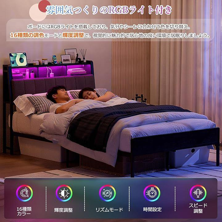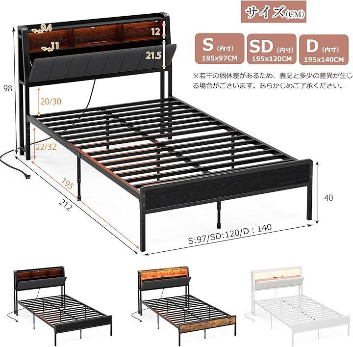 「商品仕様」*商品サイズ(cm):幅120x奥行212x高さ98cm *対応マットレスサイズ:セミダブルサイズ(幅120x長さ195cm)*商品重量:約29kg *梱包サイズ:128x43.5x14.5CM *梱包重量:32kg *材質:本体/スチール(粉体塗装)棚板/MDF *耐荷重:本体/約350kg ヘッド部棚/約20kg *カラー:ブラック/ホワイト/ビンテージ 組立品/完成品:組立品(2人で組立て時間約45分)。