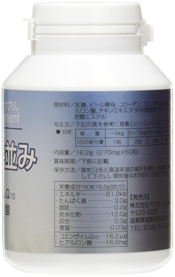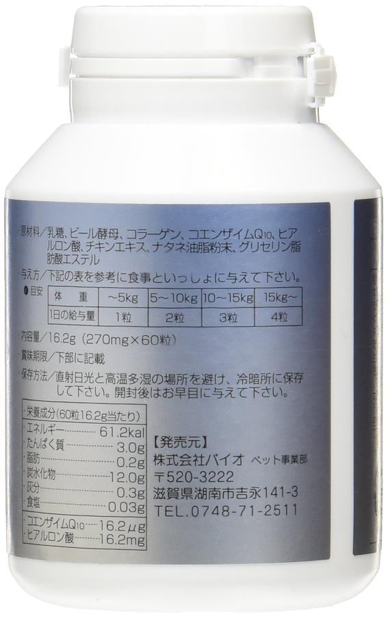 乳糖、ビール酵母、コラーゲン、コエンザイムQ10、ヒアルロン酸、チキンエキス、ナタネ油脂粉末、グリセリン脂肪酸エステル