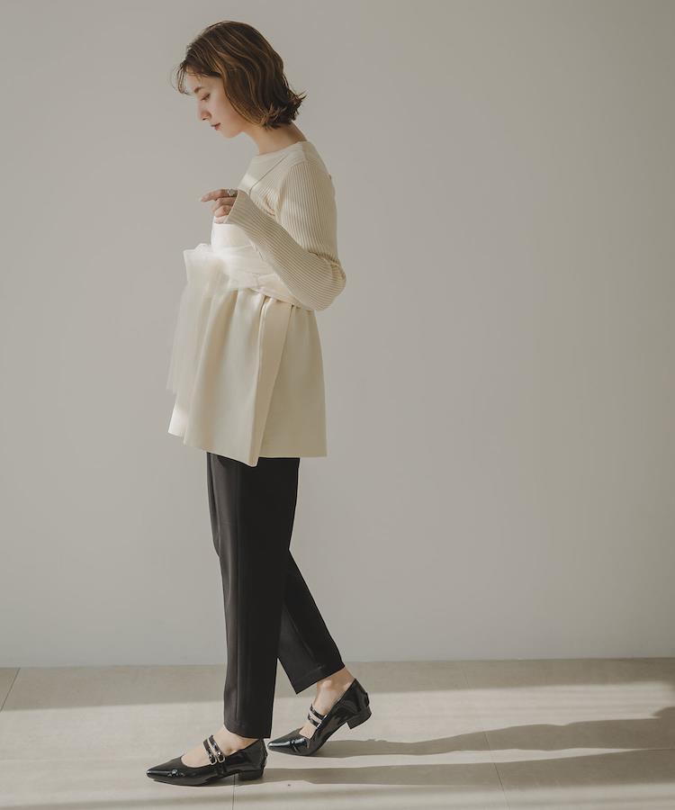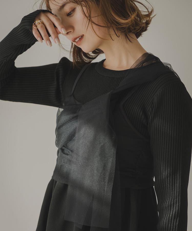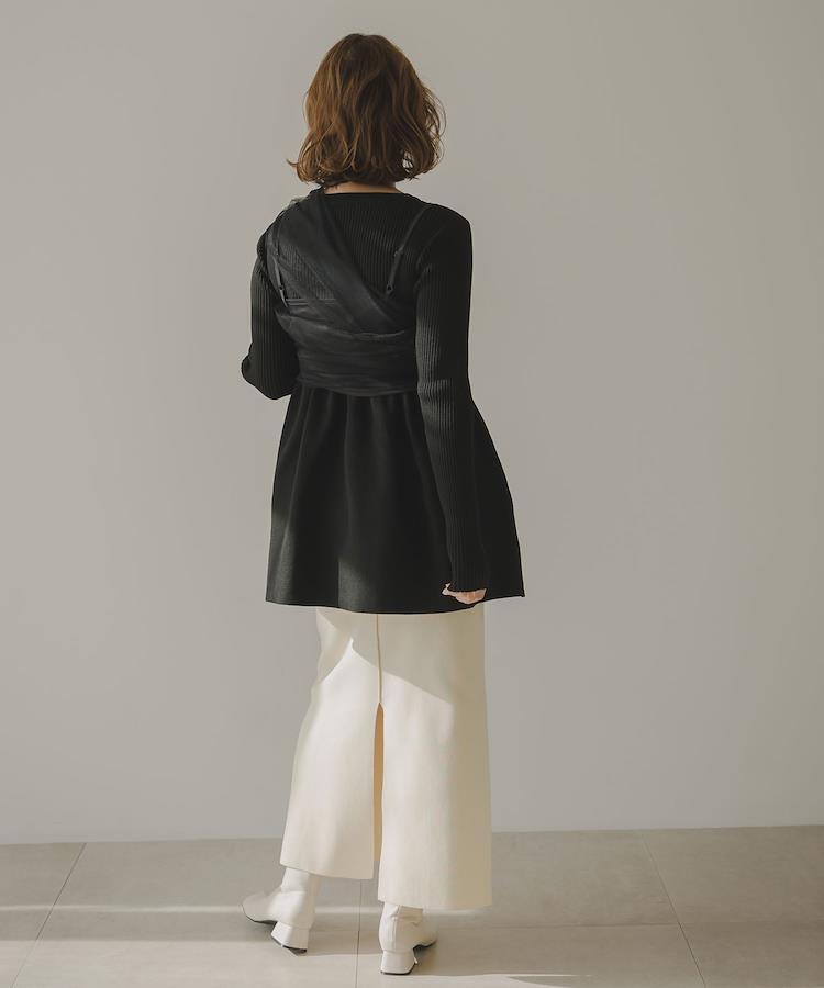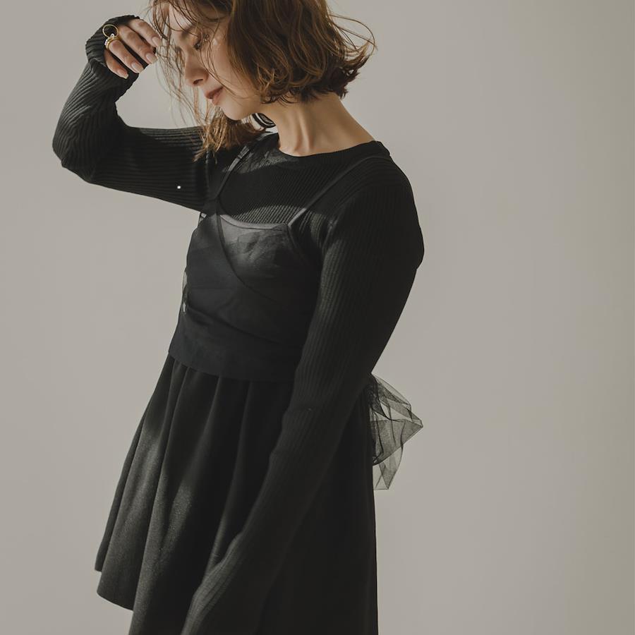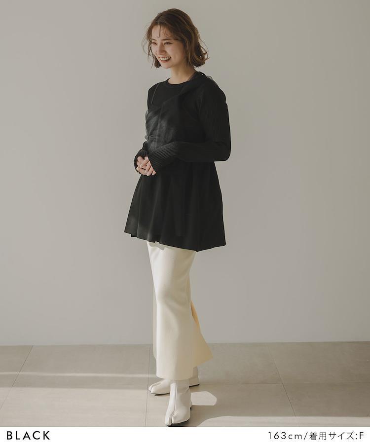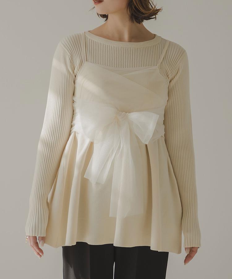 チュールリボンがポイント単品使いもできるトップス&キャミセット【ディティール】ペプラムニット大人気のペプラムリブニットが進化しました!シルエットが魅力的なトップスは、スポンジニットで編み立て自然なフワッと感をキープ。リブ編みなのですっきりとした印象に。春らしいボートネックでデコルテラインをきれいに見せてくれます。チュニック丈でさりげなく腰回りをカバーしてくれるのも◎1枚で女性らしい印象に仕上がります。ビスチェ結び方で幅広いアレンジが楽しめます。フロント結びや後ろリボンで可愛らしい印象に、たすきのように斜めで結ぶとワンランク上のコーディネートに。単品使いもできるので、ブラウスやTシャツと合わせるのもおススメです。**********************透け感:なし裏地:なし伸縮性:あり光沢感:なし生地の厚さ:普通**********************《生産国》中国