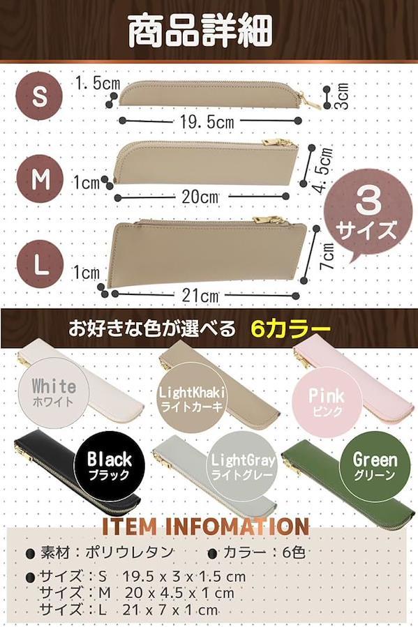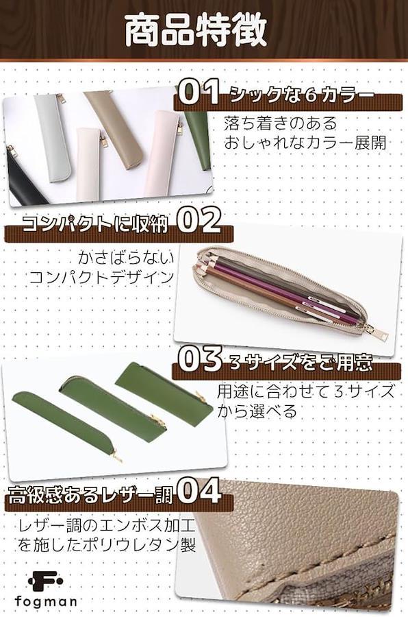 「商品特徴」(1)シックな6カラー:落ち着きのあるおしゃれなカラー展開/(2)コンパクトに収納:かさばらないコンパクトデザイン/(3)3サイズをご用意:用途に合わせて3サイズから選べる/(4)高級感あるレザー調:レザー調のエンボス加工を施したポリウレタン製