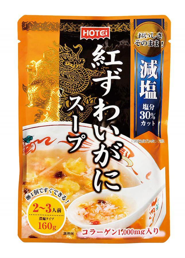 海鮮の旨味たっぷりの「紅ずわいがにスープ」を家庭で手軽に楽しめる濃縮タイプにしました。紅ずわいがに、たけのこ、きくらげが入っており、豚ガラ、鶏ガラの旨味をベースに塩味であっさり仕上げ、蟹肉の紅色が映える透明なスープにしました。本品160gに対し、水350ml を加えて沸騰させ、とき卵を加えれば簡単に2~3 人前の中華スープが出来上がります。女性に嬉しいコラーゲン1,000mg 入りです。食塩の一部をカリウム塩で置き換えるとともに、ガラスープや香辛料、かにの風味を増すことで、既存品に比べ30%減塩しながらもおいしさそのままに仕上げました。1袋(160g)あたり:エネルギー106kcal、たんぱく質5.8g、脂質5.3g、炭水化物8.8g、食塩相当量2.4g、コラーゲン1000mg