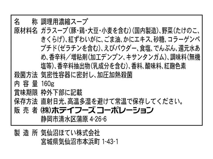 原材料:ガラスープ(豚・鶏・大豆・小麦を含む)(国内製造)、野菜(たけのこ、きくらげ)、紅ずわいがに、ごま油、かにエキス、砂糖、コラーゲンペプチド(ゼラチンを含む)、えびパウダー、食塩、でんぷん、還元水あめ、香辛料、増粘剤(加工デンプン、キサンタンガム)、調味料(無機塩等)、香辛料抽出物(乳成分を含む)、香料、酸味料、紅麹色素内容量:160g×5袋商品サイズ(高さx奥行x幅):17.7cm×1.6cm×12cm【重要】メーカーによる商品リニューアルに伴いパッケージ(内容量も含む)変更が行われた場合、新パッケージでお届け致します事ご了承願います。