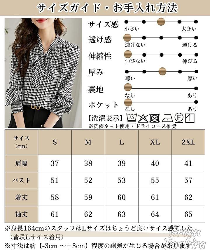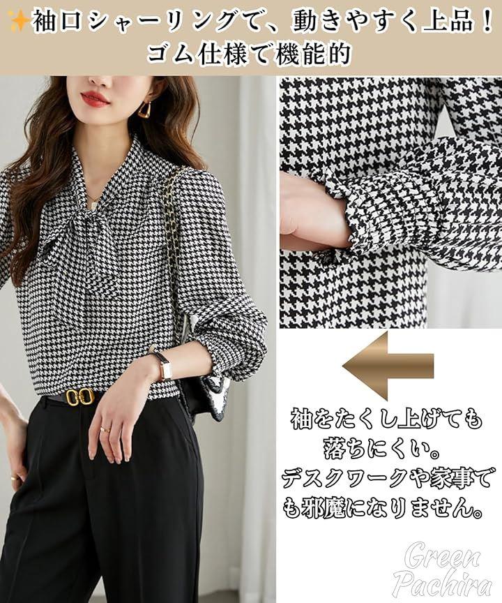 「千鳥格子&リボンタイで大人可愛い推しブラウス」レディースの長袖 ボウタイブラウスは、白黒の千鳥柄とリボンタイがポイントのきれいめなトップスです。