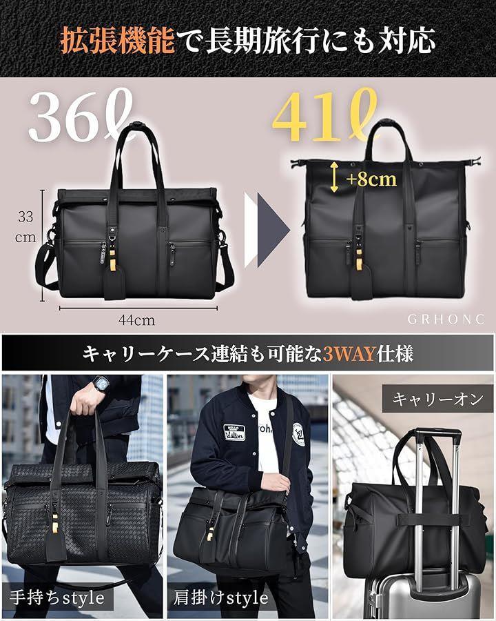 「商品タイプ」クラシック/イントレチャート「サイズ」横幅44cmx高さ33cm(拡張時41cm)x厚さ23cm「重量」910g「素材」高品質PUレザー「機能・特徴」拡張可能/大容量34-41L/軽量/防水加工/外側収納/乾湿分離ポケット/取り外し式ストラップ/キャリーオン対応/機内持ち込み可能