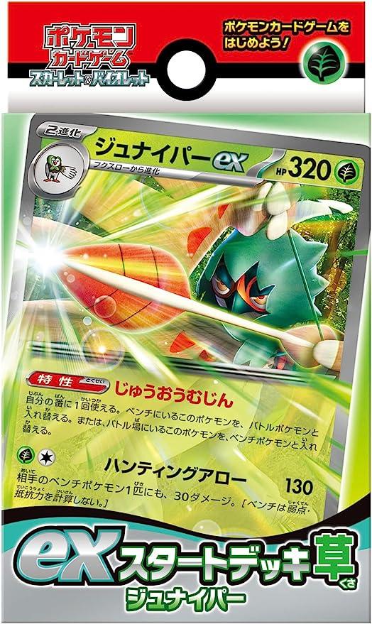 exスタートデッキとは?ここからバトルスタート、exスタート!キミはどれを選ぶ?「草」「炎」「水」「雷」「超」「闘」「悪」「鋼」の8タイプのポケモンたちを中心にした、8種類の60枚デッキ。ジュナイパーexやミライドンexなど、それぞれのデッキにはポケモンexが必ず1枚入っている。デッキごとに異なる特徴を持っているため、それぞれ違った遊びかたで楽しめるぞ。お気に入りのデッキを見つけてみてみよう!
