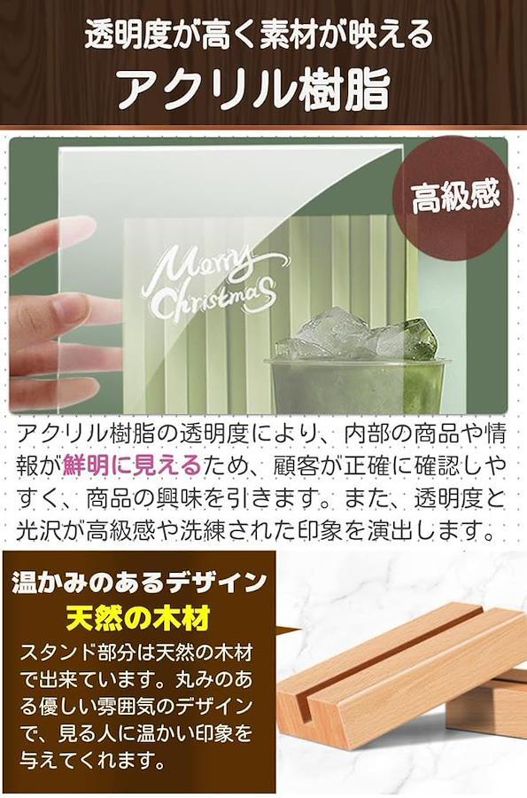 「アクリル樹脂」アクリル樹脂の透明度により、内部の商品や情報が鮮明に見えるため、顧客が正確に確認しやすく、商品の興味を引きます。