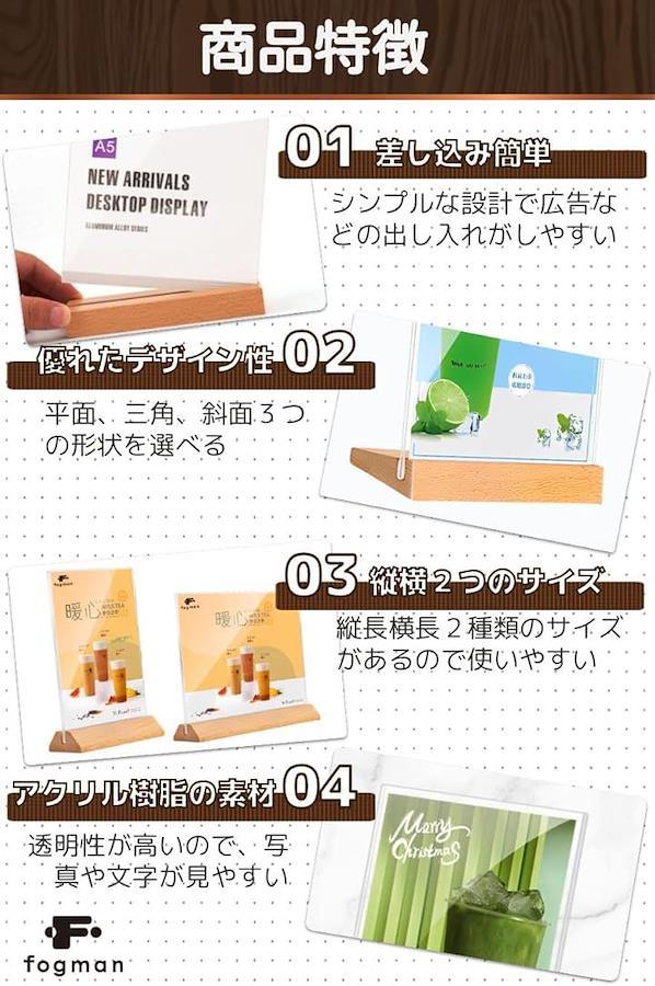 「商品特徴」(1)差し込み簡単:シンプルな設計で広告などの出し入れがしやすい/(2)優れたデザイン性:平面、三角、斜面3つの形状を選べる/(3)縦横2つのサイズ:縦長横長2種類のサイズがあるので使いやすい/(4)アクリル樹脂の素材:透明性が高いので、写真や文字が見やすい