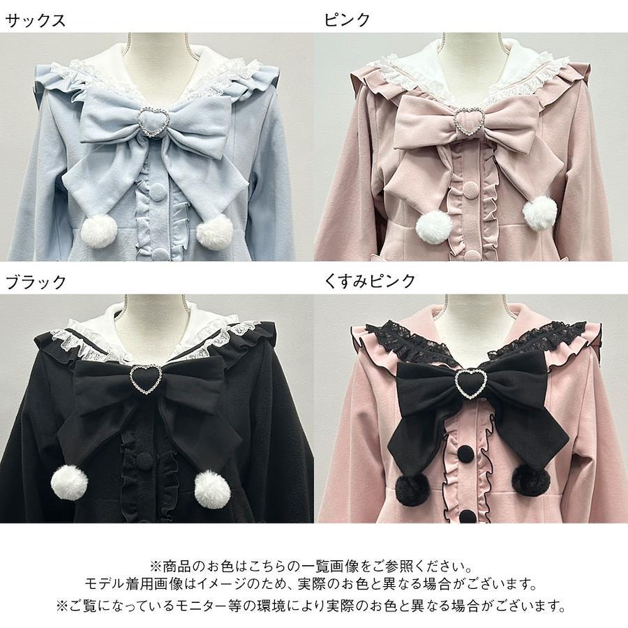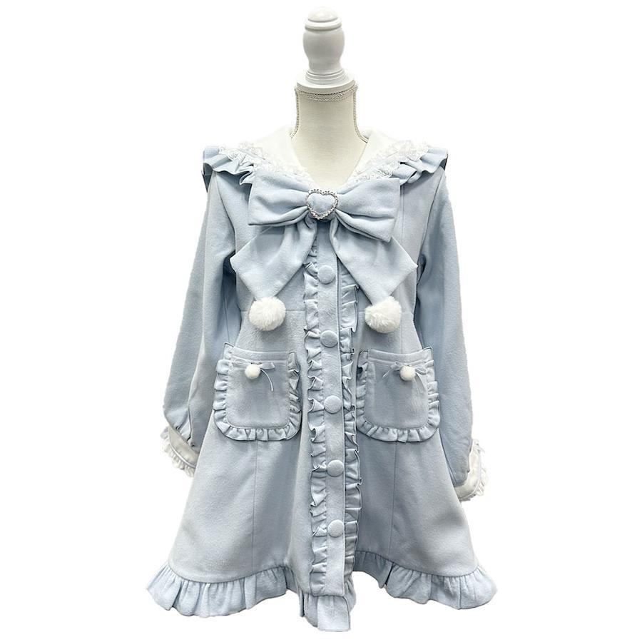 かわいすぎるセーラーフリルコートが新しくなって登場♪【デザイン】人気のセーラー襟デザインのかわいいAラインコートが新しくなって登場♪ポンポンリボンがかわいく、冬にぴったりのデザインになっています。フリルたっぷりで、襟にはレースがあしらわれていてどこを見てもかわいいデザイン。後ろには大きめリボンがついています。袖口、ポケットリボンは安全ピンで取り外し可能です。前立てのスナップボタンで着用が可能です。襟リボンは安全ピンで取り外し可能です。【素材】重みのある、ウールタッチの素材を使用しています。中綿などは入っていないので、着ぶくれしにくい素材感です。《透け感》なし 《生地の厚さ》普通 《裏地》あり 《伸縮性》なし《生産国》中国