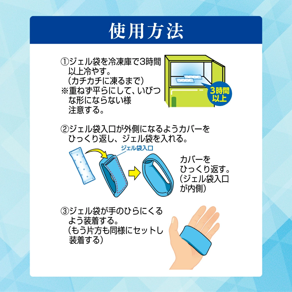●手のひらをほどよく冷やす冷却バンドです●睡眠時や運動前後のクーリングに便利です●専用ジェル袋で約20分冷感を持続※冷感時間は使用状況によりことなります●手になじむ大きさと軽さで使いやすい形状です●予備ジェル袋付属で安心です(計4個付属)