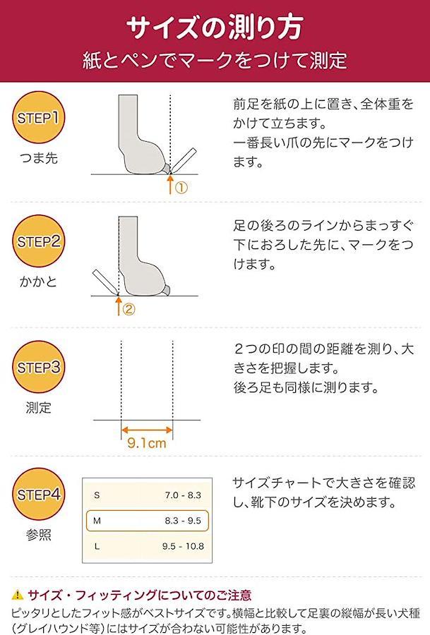 横幅と比較して足裏の縱幅が長い犬種(グレイハウンド等)にはサイズが合わない可能性がございます。