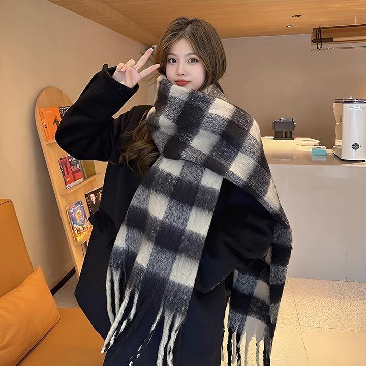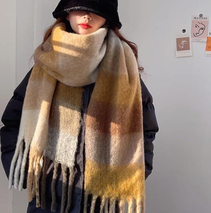 「使用例」 厚手マフラーは、寒い季節の防寒対策には必須アイテムで、首や羽織もの、お子様の昼寝布団としても様々な使い方ができます。。フリンジの長さ20cm.厚さ1cm。