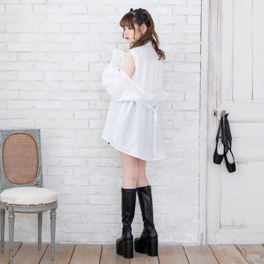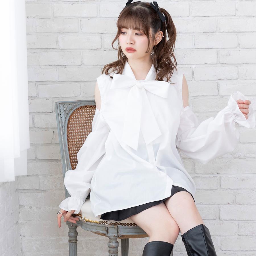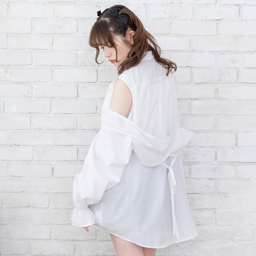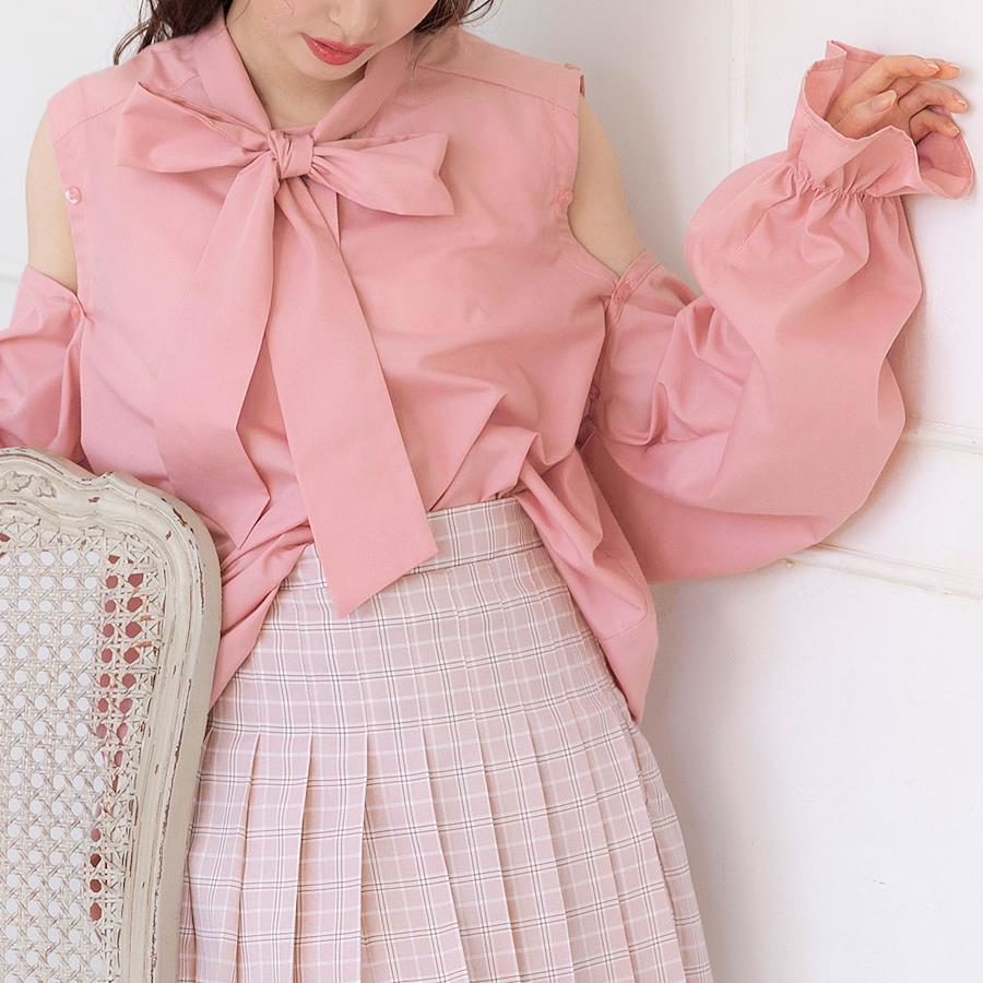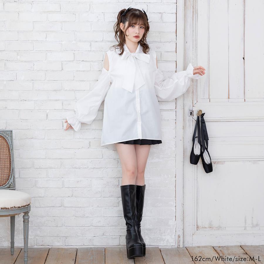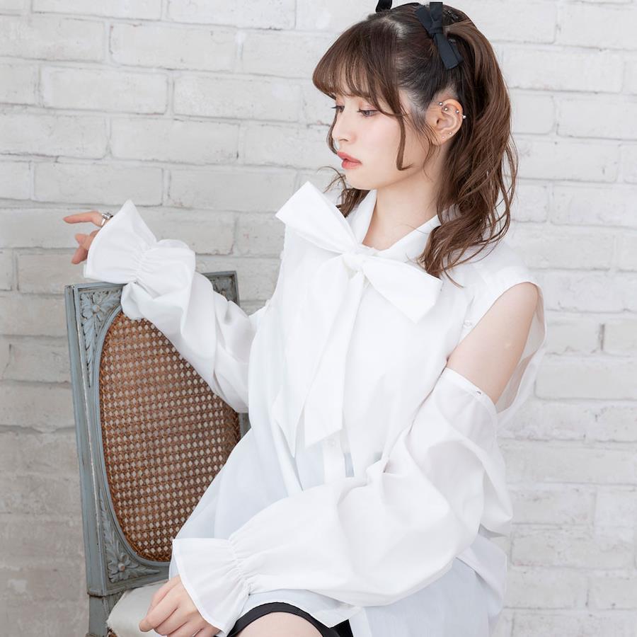 マルチwayで色んな着方が楽しめるボウタイシャツワンピのご紹介。【デザイン】大人気のマルチwayビッグ襟シャツワンピースがボウタイ襟Ver.になって登場♪マルチwayになっているので、そのままで着るのはもちろん肩のボタンを開けてちらっと肌見せしたり、ボタンを全部外してボレロを取ればノースリーブで着ることも出来ちゃう優れもの♪後ろ身頃に付いているボレロのリボンはご自身で結んでいただく仕様です。着用前にお好みの結び具合で調節してください◎たっぷりボリューミーなお袖とヒップがすっぽり隠れるチュニック丈になっていて、絶妙な“ゆるだぼ感”があざと可愛いシルエットに♪前身頃のボタンを開けて着脱できる仕様になっているので、メイクやヘアアレンジをした後でも気にせず着用いただけます。