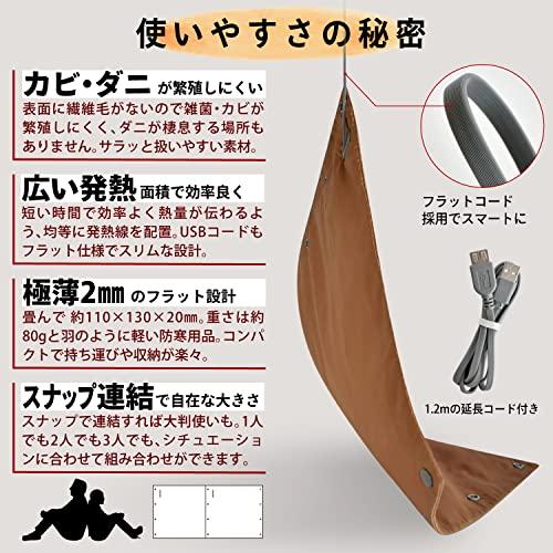 通常1-5営業日で発送:サイズ:最大約H380×W350×D2mm 重さ:本体約80g 電源:5V/2A(推奨)~USB電源 ケーブル長:約400mm ヒーター温度:約39℃ 素材:ナイロンPoint1.【家計に優しい省エネ設計】・1日5時間使用して、1日あたりの電気約0.02Kwh。Point2.【USB給電だから便利 】<<出力5V1A以上の電源を使用してください>> ・PC等のUSBポートから簡単に給電。 ・携帯電話/スマートホン用のバッテリー等を使って給電。Point3.【極薄2ミリのフラット設計】畳んで 約110×130×25。重さは約80gと羽のように軽い防寒用品。コンパクトで持ち運びや収納が楽々。Point4.【 カビ・ダニが繁殖しにくい】表面に繊維毛がないので雑菌・カビが繁殖しにくく、ダニが棲息する場所もありません。サラッと扱いやすい素材。