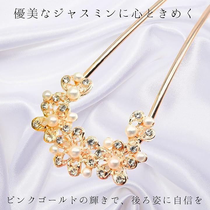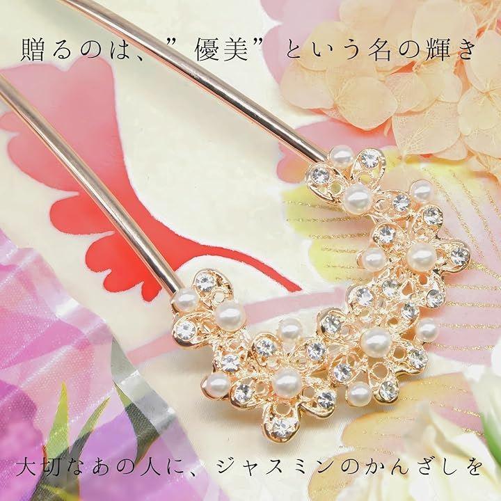「ジャスミンフラワーデザインの特徴」優雅な曲線を描くバチ型フォルムに、愛らしいジャスミンの花々を贅沢にあしらったかんざしです。