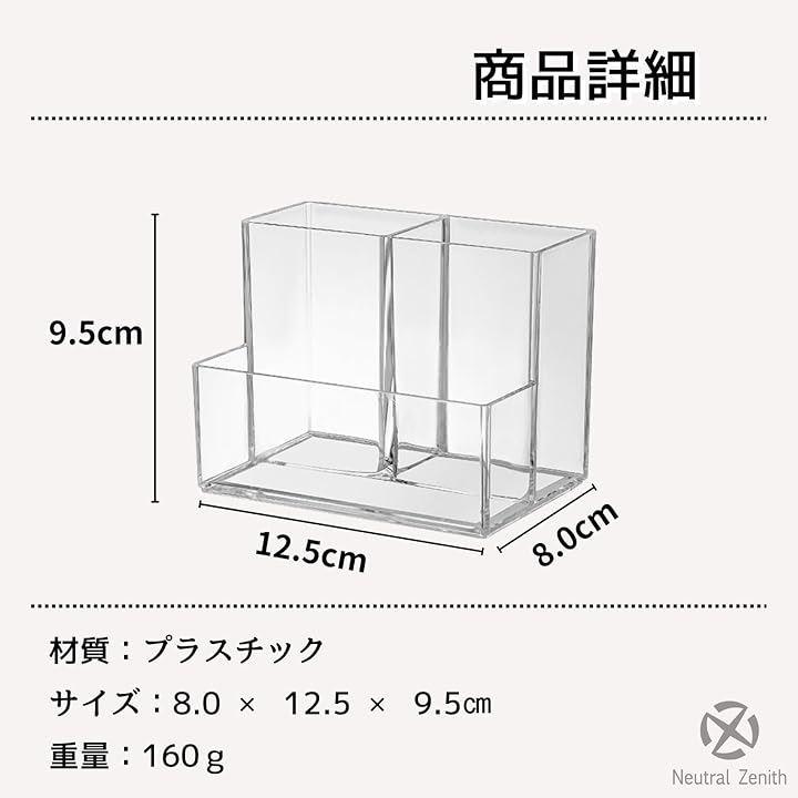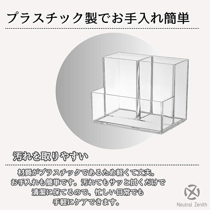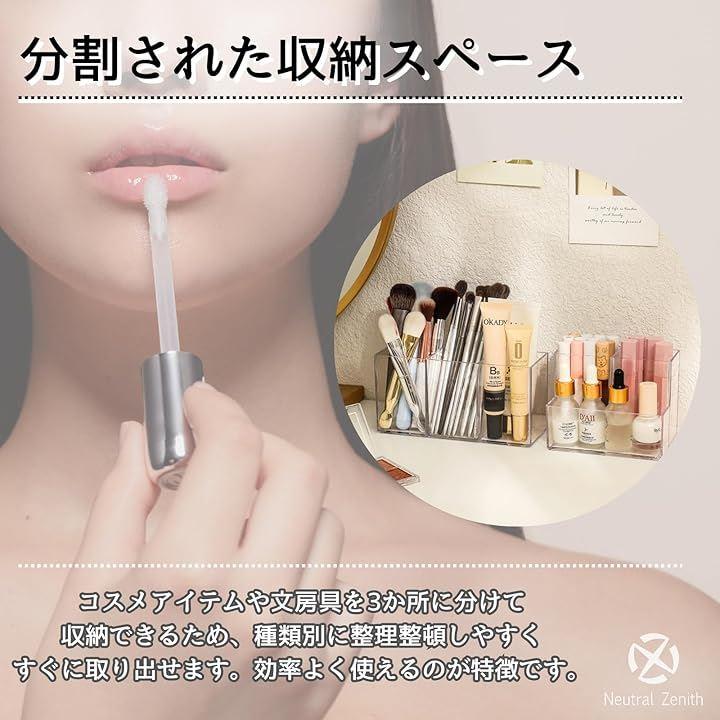 「分割された収納スペース」コスメアイテムや文房具を3か所に分けて収納できるため、種類別に整理整頓しやすく、すぐに取り出せます。
