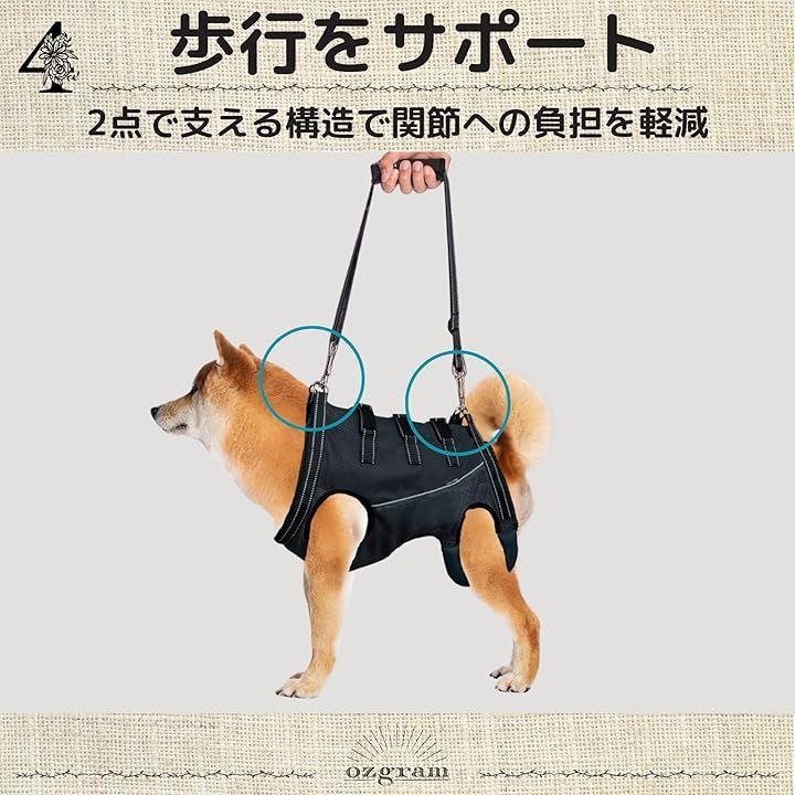 「歩行をサポート」 一般的なハーネスとは違い、首と腰の2点で支える構造なのでシニア犬や関節に不自由を感じる子の負担を軽減しながら散歩が行える関節ケアサポートに最適です。