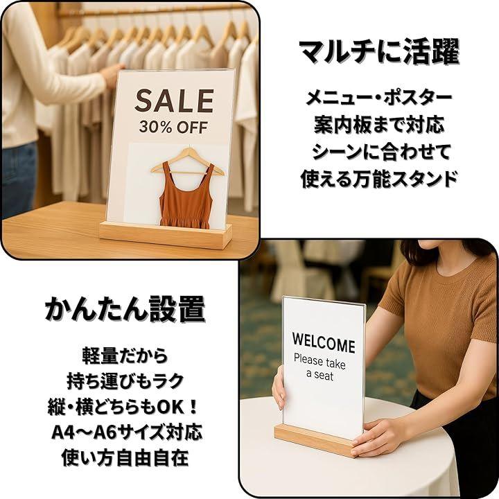 「多用途対応」各サイズに対応したこのスタンドは、メニューだけでなく、プロモーションポスターや案内板としても活用可能です。
